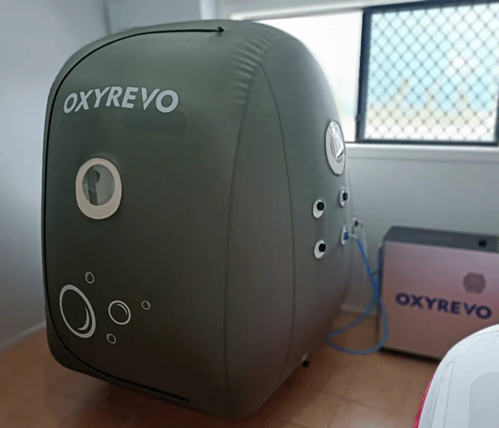 Includes a 10L oxygen concentrator delivering 90–97% pure oxygen throughout every session.