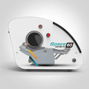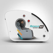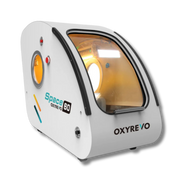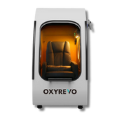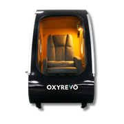 The OxyRevo Space60 is a hard-shell chamber for sitting or reclining, with a reclining chair included. It runs at 1.5 to 2.0 ATA. Made of stainless steel, brushed aluminum, and windows manufactured from Bayer Germany, it has a clear front door and two side windows.