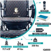 MAJESTIC IQ-8000 wheelchair comes with a lighweight frame and two battery sizes to choose from. You can also choose from 3 frame colors and 8 cushion colors to create your own unique style. Not only does the IQ-8000 offer unrivaled comfort with its memory foam gel inserts silicon cushion feature, but it also includes a practical under-seat storage bag for your belongings.