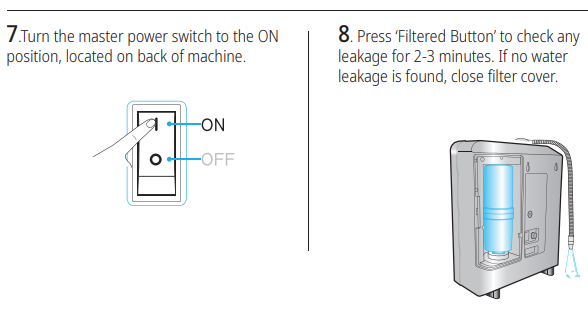 Turn on the water: Set the water knob to the "On" position to allow water to flow through the unit. Let the water run until it starts coming out from the top of the machine.