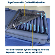 Specially designed 15-degree self-lateral rotation utilizing cone-shaped air cells,continuously deflating and inflating cone-shaped air cells provide the user with a regular wave and soft self-lateral rotation via alternating pressure. This therapy aids in redistributing the user’s weight to alleviate pressure points, while simultaneously stimulating blood flow to nourish the skin and prevent bedsores.