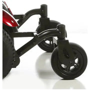 The front wheels are equipped withMerit's patented articulation mechanisms and its two rear wheels provides additional stability; especially on rough terrain. The P326A maintains a noticeably stable center of gravity, reassuring the rider that he or she is always in control of the chair.
