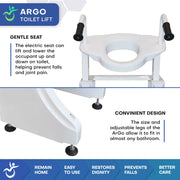 The ArGo Toilet Lift prioritizes safety with its electric toilet lift mechanism. It features handle grips for added stability and a slow descent and ascent mechanism, ensuring smooth and controlled movements during toilet transfers. These safety features make the ArGo Toilet Lift an ideal choice for those seeking an ergonomic and safe toilet lift.
