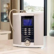 A sleek water ionizer with a digital display and control buttons, featuring a spout for dispensing water.